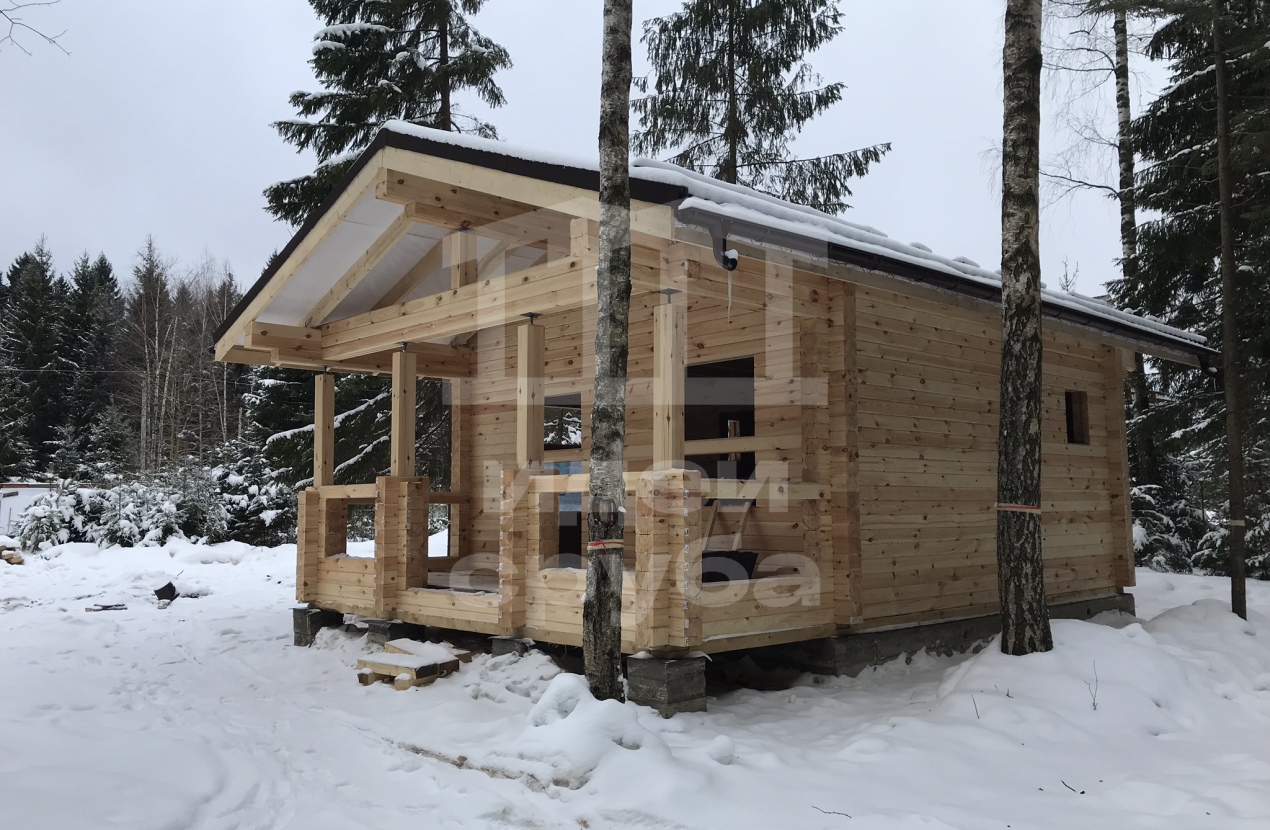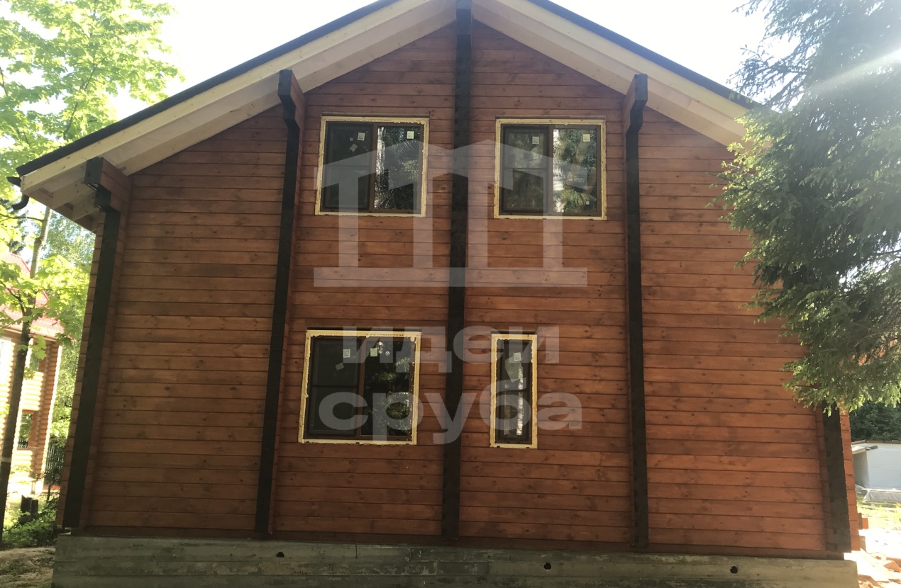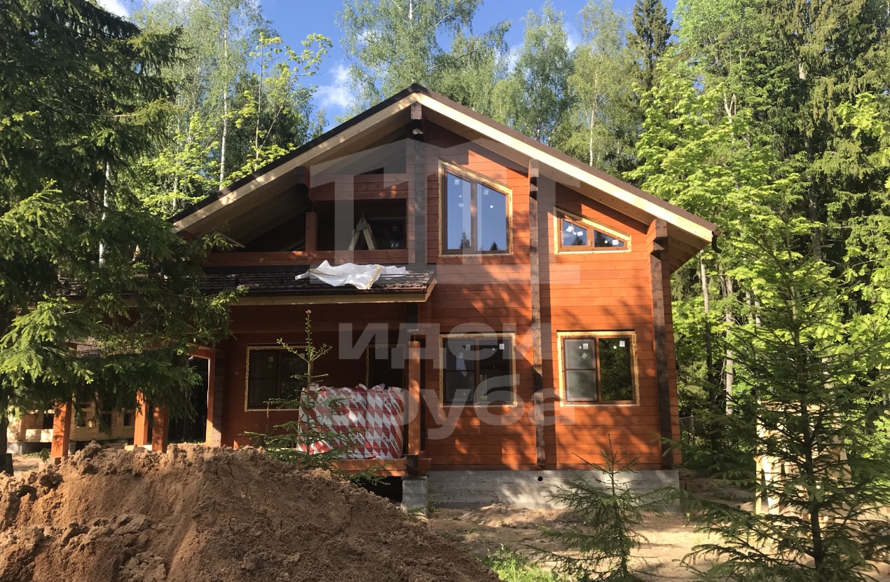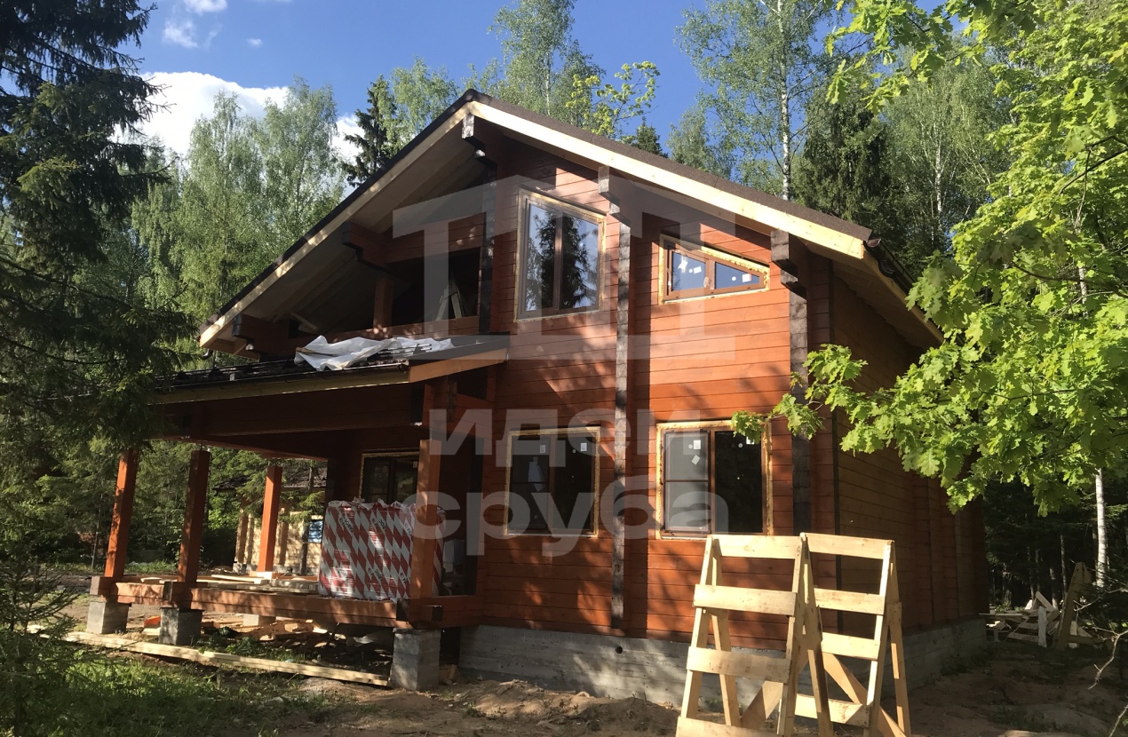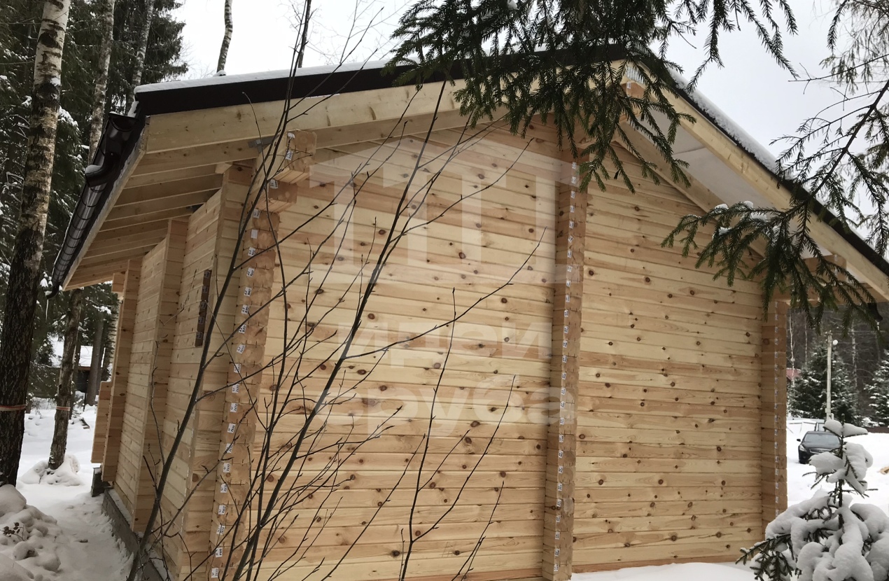 Индивидуальный проект дома из клееного бруса 185х204 и бани из профилированного бруса камерной сушки. Фундамент свайно-ростверковый залит в ноябре 2018, дом с баней смонтированы в январе 2019. Кровля выполнена из очень интересного материала – композитной черепицы. Объекты покрыли маслами “Osmo”. В данный момент все отделочные работы выполнены.