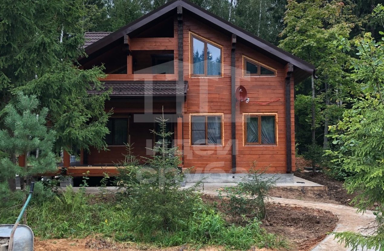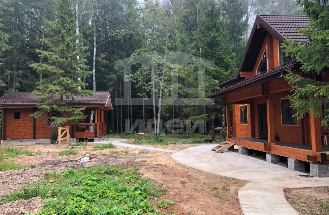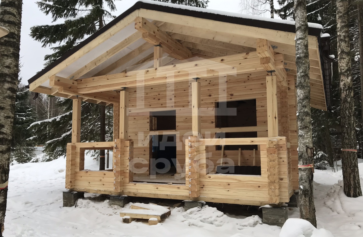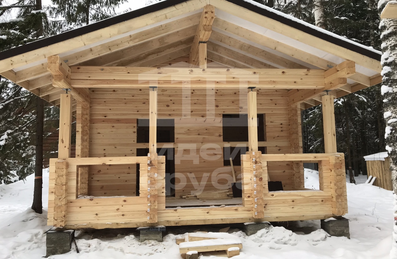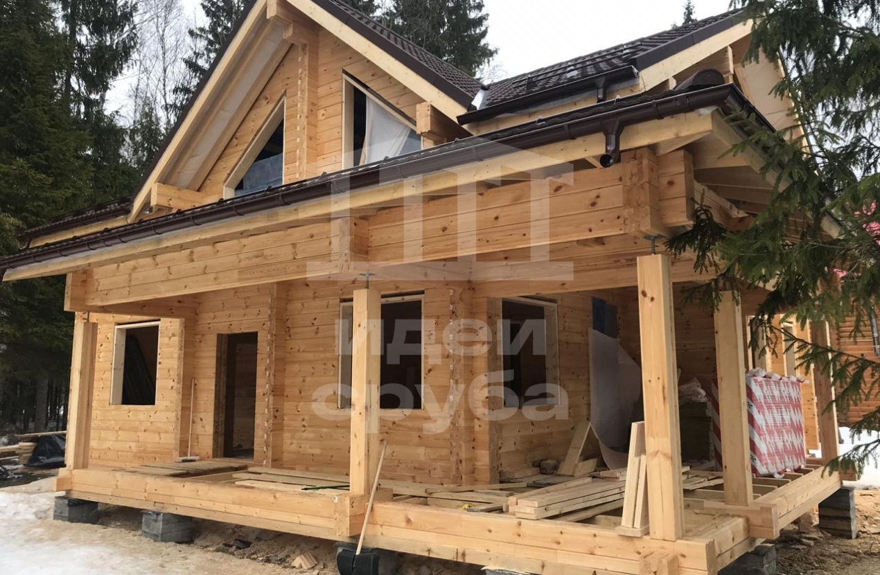 Индивидуальный проект дома из клееного бруса 185х204 и бани из профилированного бруса камерной сушки. Фундамент свайно-ростверковый залит в ноябре 2018, дом с баней смонтированы в январе 2019. Кровля выполнена из очень интересного материала – композитной черепицы. Объекты покрыли маслами “Osmo”. В данный момент все отделочные работы выполнены.