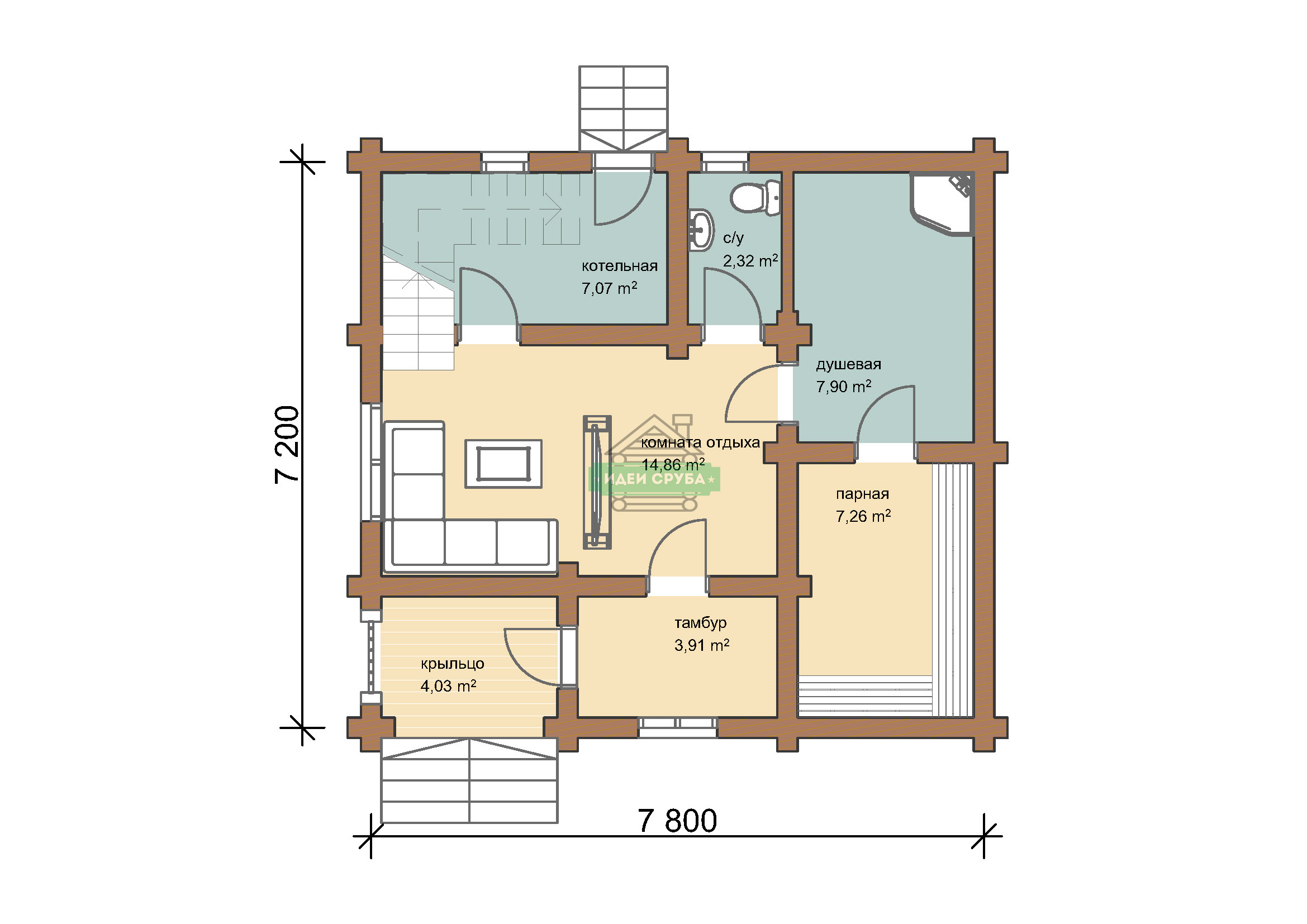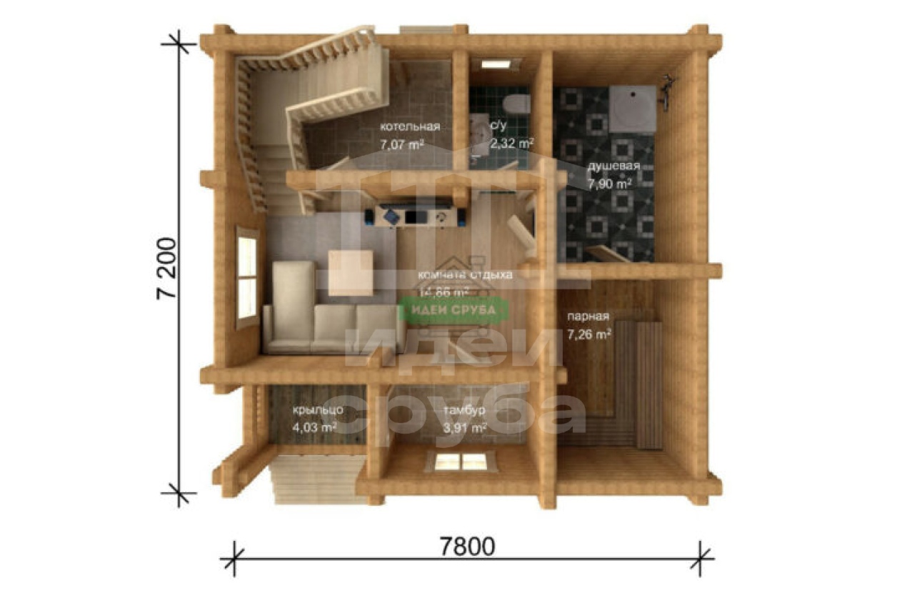 Проект "Березка" представляет собой изысканную баню, где каждая деталь продумана для вашего максимального удовольствия. С размерами 7x8 метров и общей площадью 107.1 квадратных метра, включая 102.6 квадратных метра жилой площади, эта баня создана для вашего настоящего релакса.