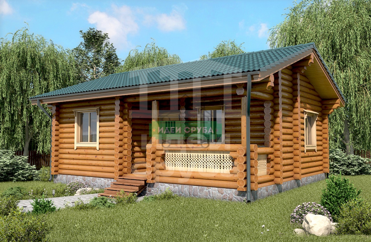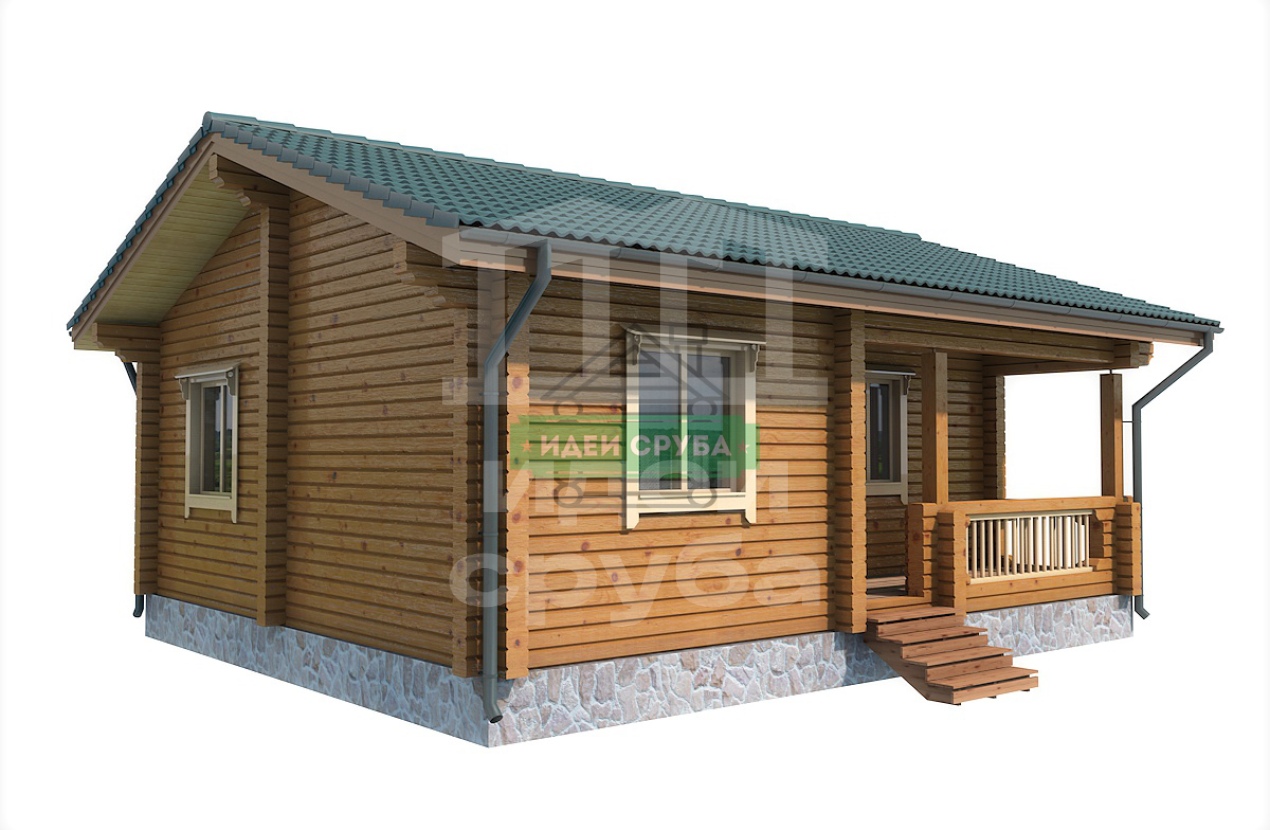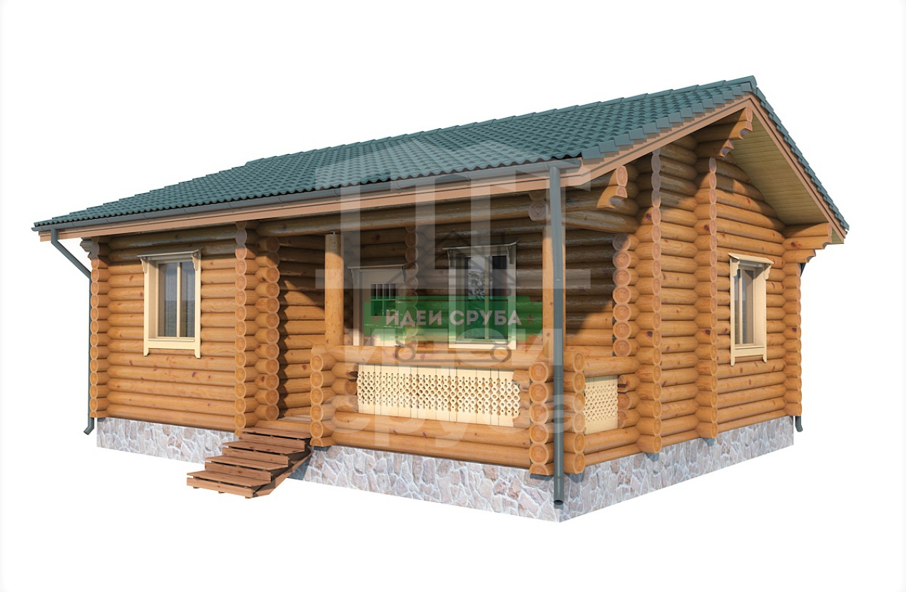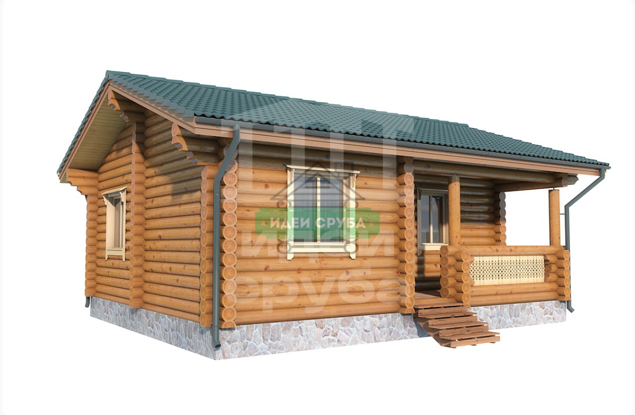 Проект оригинального деревянного дома из оцилиндрованного бревна «Веста». Это одноэтажный дом с одной комнатой общей площадью 59 кв. м. Жилая площадь – 51 кв. м. С просторной террасы мы попадаем в прихожую. С нее открывается вход в совмещенную с просторной гостиной кухню-столовую. Отдельно стоит санузел и рядом небольшая спальня, общей площадью 9.97 кв. м. Просторная терраса может использоваться не только для летнего отдыха. Проект дома для небольшой семьи подойдет как летний домик, как дача или гостевой домик для обустройства территории загородного дома.