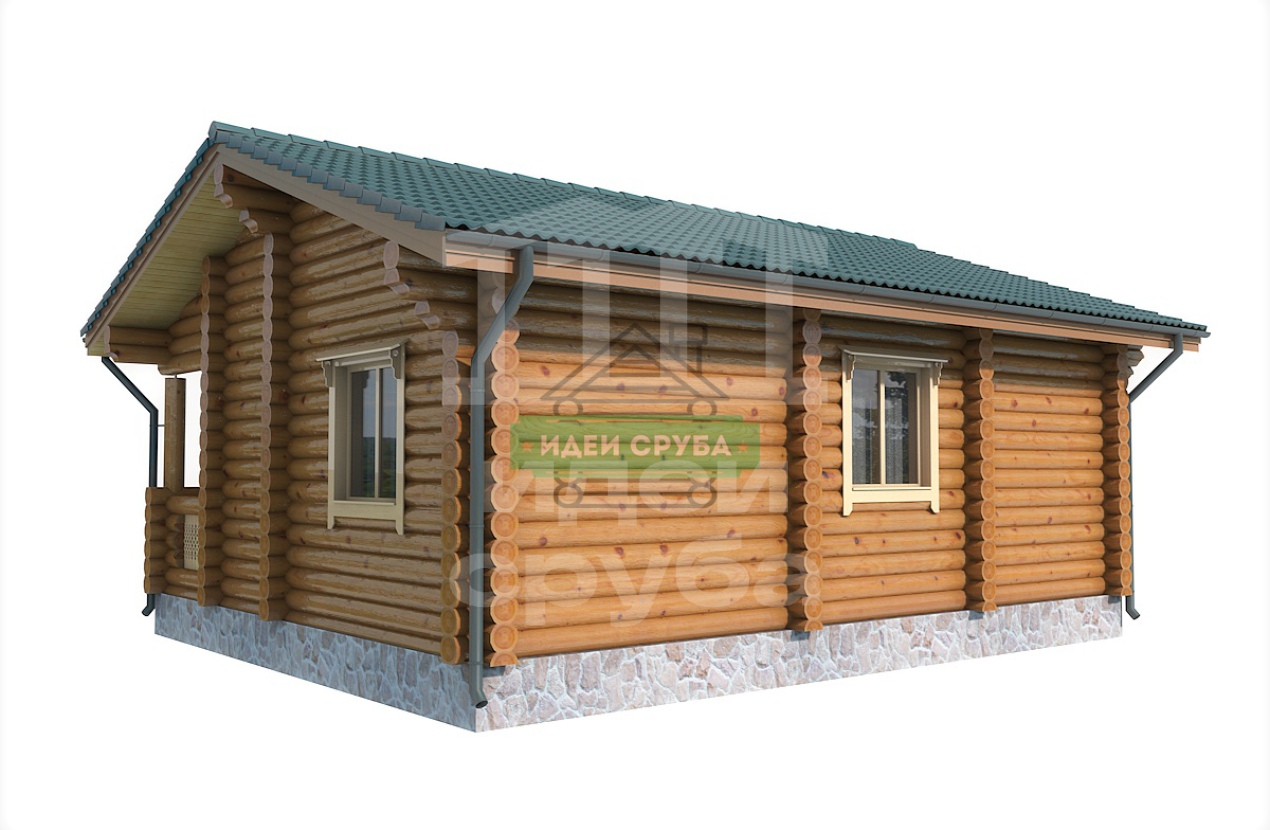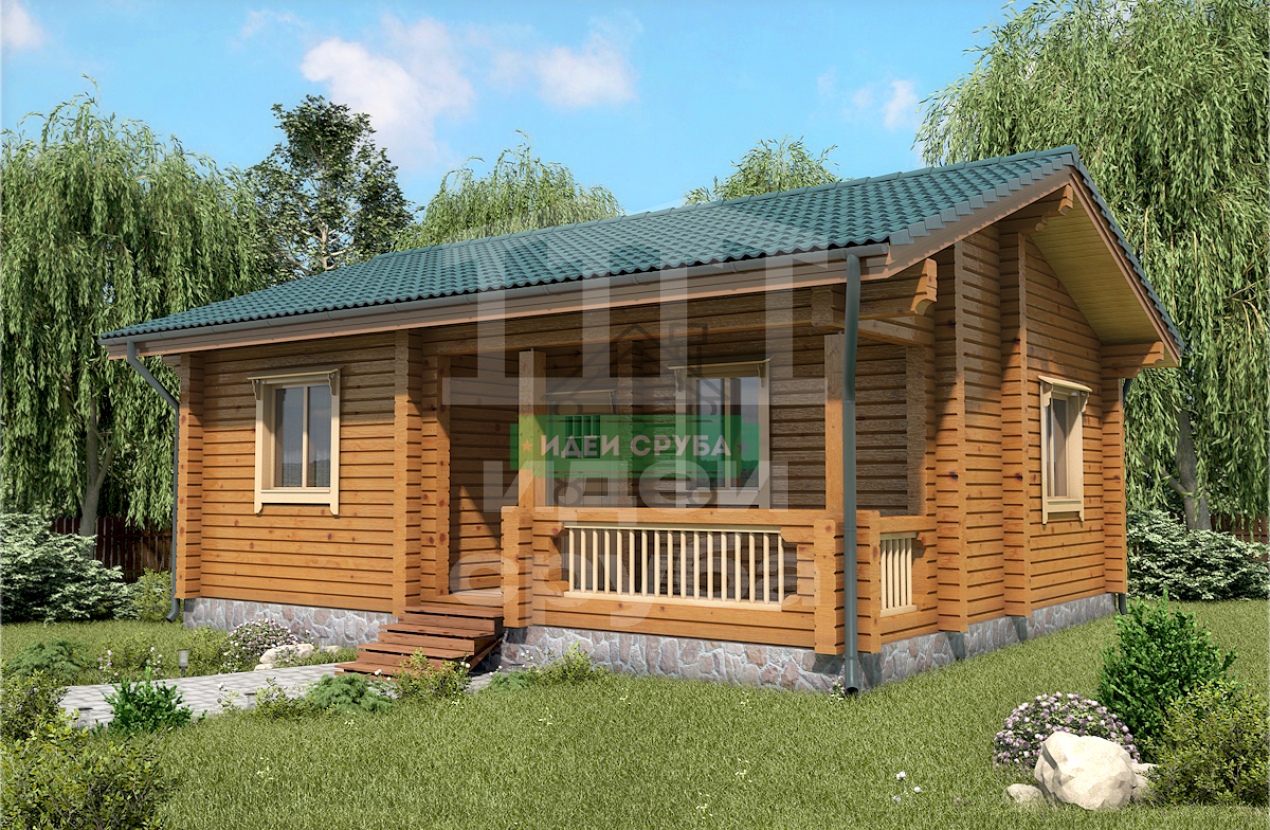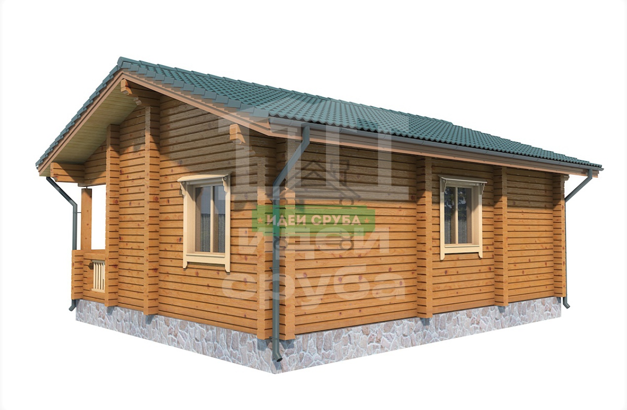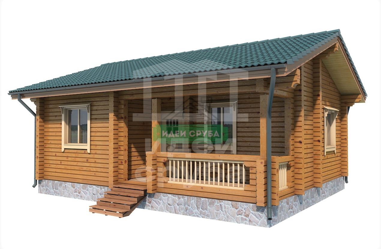 Проект оригинального деревянного дома из оцилиндрованного бревна «Веста». Это одноэтажный дом с одной комнатой общей площадью 59 кв. м. Жилая площадь – 51 кв. м. С просторной террасы мы попадаем в прихожую. С нее открывается вход в совмещенную с просторной гостиной кухню-столовую. Отдельно стоит санузел и рядом небольшая спальня, общей площадью 9.97 кв. м. Просторная терраса может использоваться не только для летнего отдыха. Проект дома для небольшой семьи подойдет как летний домик, как дача или гостевой домик для обустройства территории загородного дома.