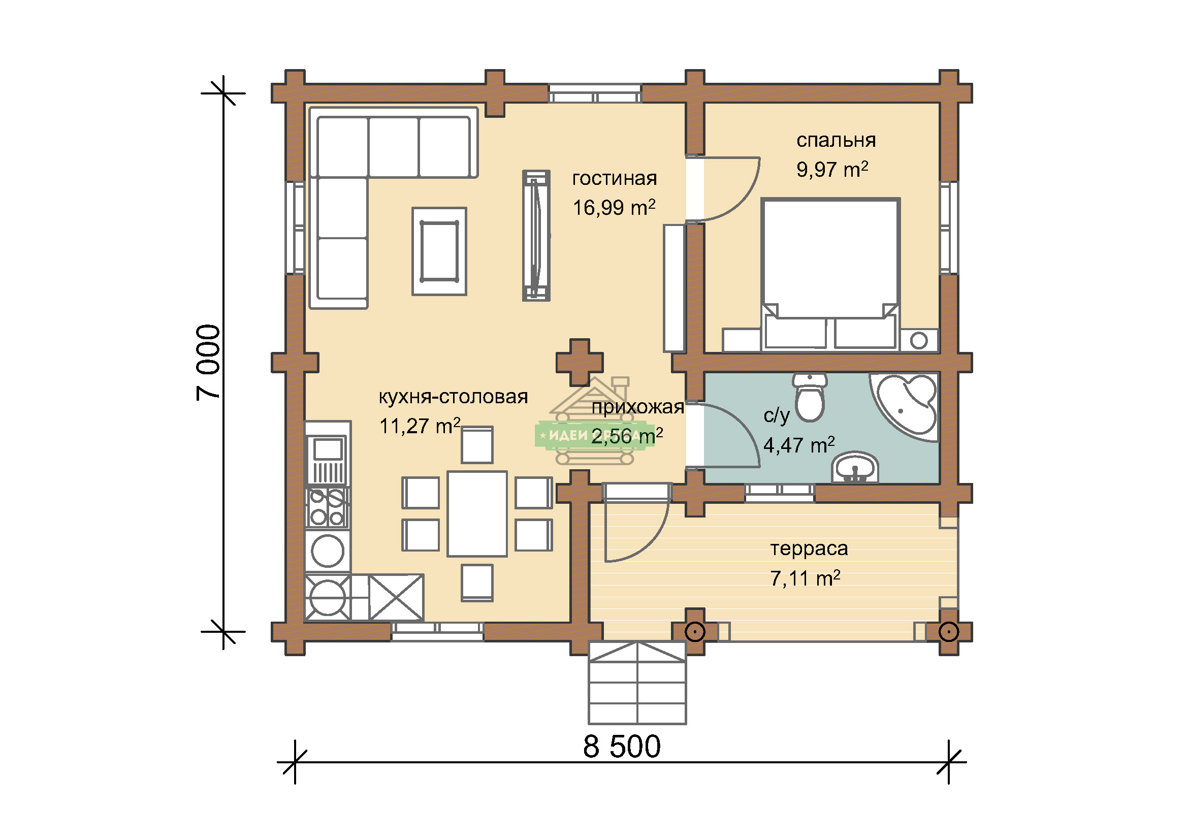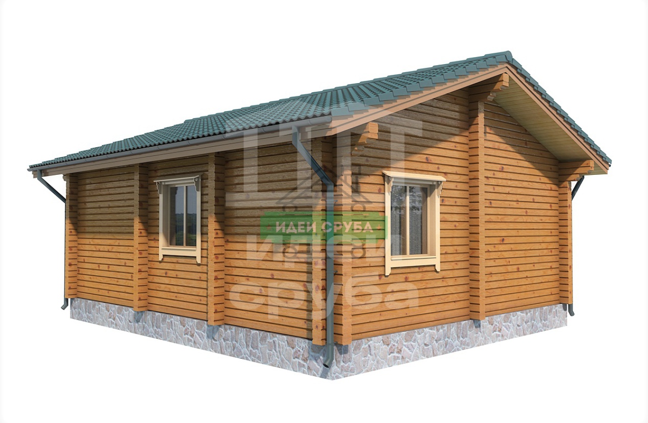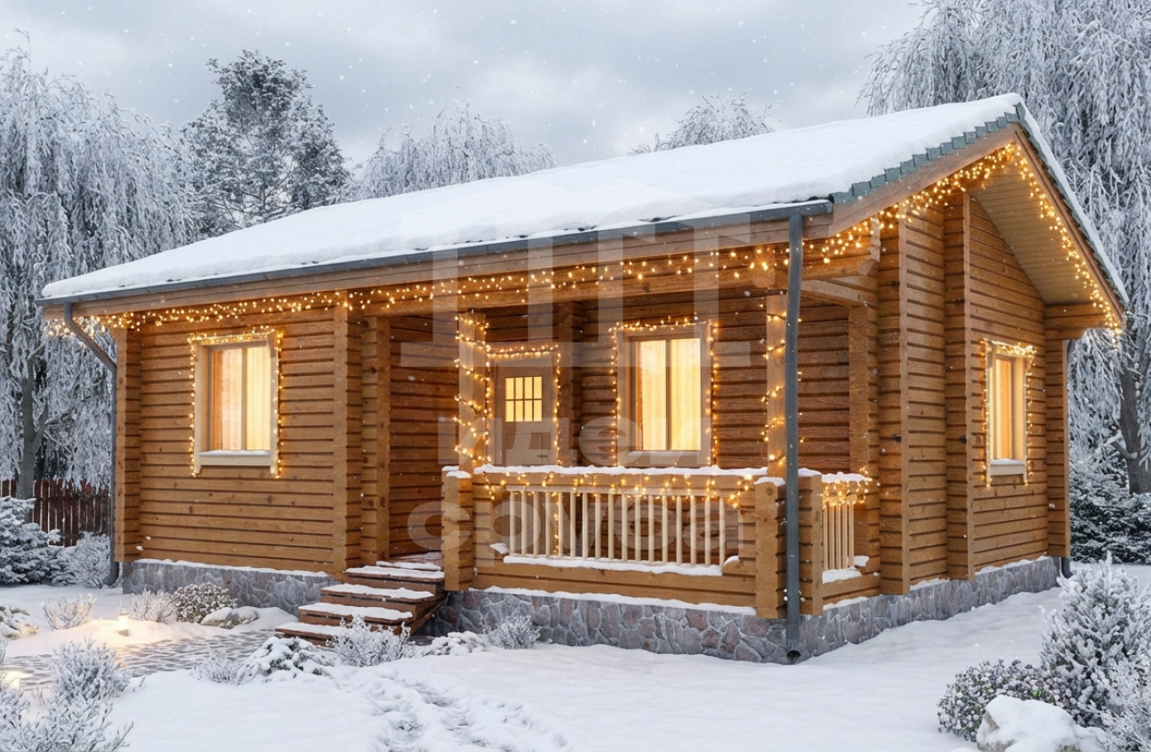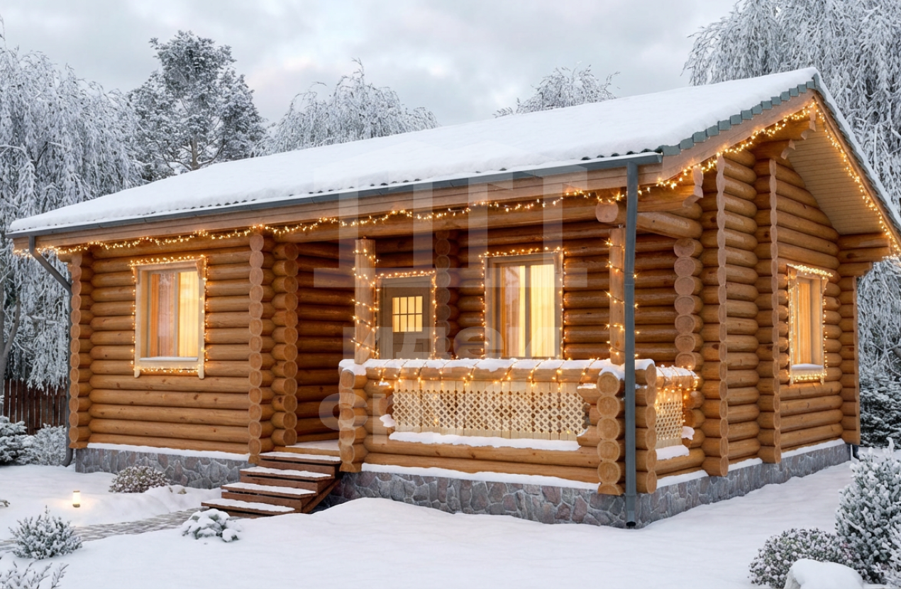 Проект оригинального деревянного дома из оцилиндрованного бревна «Веста». Это одноэтажный дом с одной комнатой общей площадью 59 кв. м. Жилая площадь – 51 кв. м. С просторной террасы мы попадаем в прихожую. С нее открывается вход в совмещенную с просторной гостиной кухню-столовую. Отдельно стоит санузел и рядом небольшая спальня, общей площадью 9.97 кв. м. Просторная терраса может использоваться не только для летнего отдыха. Проект дома для небольшой семьи подойдет как летний домик, как дача или гостевой домик для обустройства территории загородного дома.